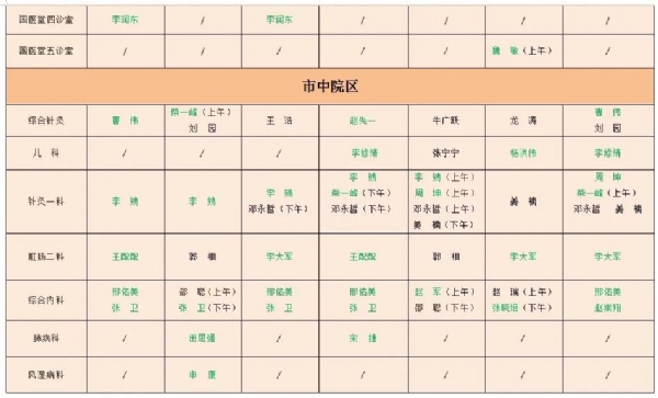备注:绿色为专家或科主任,黑色为主治医师或普通门诊,“/”表示当日无门诊排班。1、新城院区地址:薛城区太行山路2666号,枣庄高铁站东1000米,预约咨询电话:0632-3068122,3062395. 总值班电话:3068366;2、市中院区地址:市中区公胜街24号,预约咨询电话:0632-3068277,总值班电话:3068018。