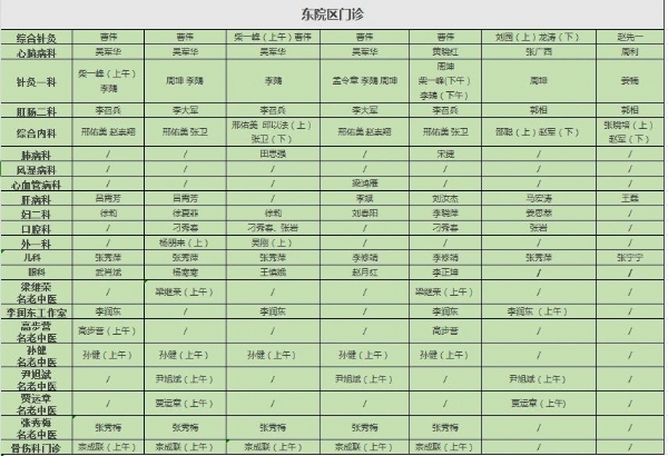 感谢您一直以来对我院的支持与信任!为了方便您就医,现将我院新城院区和东院区一周门诊排班公布如下,以供您参考,合理安排就诊时间。北京中医药大学东方医院枣庄医院各科室医务人员持续为您的健康保驾护航!