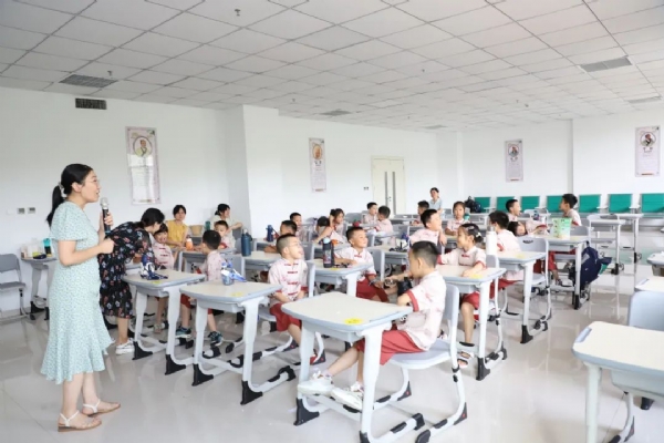 午休结束后,小同学们在大厅跟随老师学习国风气功-《八段锦》。