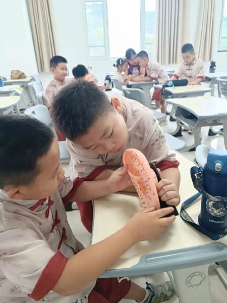 随后,开始中医经典《素问·上古天真论》朗读,“昔在黄帝,生而神灵,弱而能言,幼而旬齐,长而敦敏,成而登天...”孩子稚嫩的声音好像穿越回古代中医药课堂。