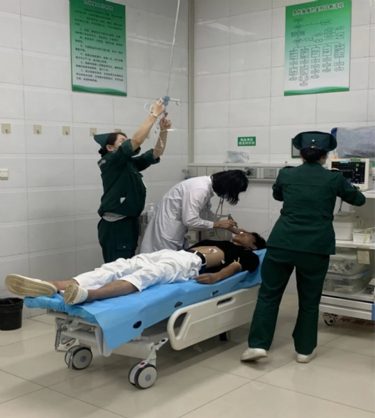 本次演练,急诊科模拟接诊1名患者在室外高温闷热环境下劳作2小时后突然昏倒,不省人事,体温41℃,被家属急送至我院急诊科就诊。我院急诊科迅速接诊,开通绿色通道。值班医生快速询问患者家属病史,评估患者病情,医护人员共同协作,测体温,同时予心电监护、查体,并完善相关检查,根据患者症状体征,结合辅助检查,高度怀疑热射病,迅速建立双静脉通路快速扩容补液,同时予一系列降温措施,患者病情危重,请重症医学科会诊后,转入重症医学科进行下一步救治。