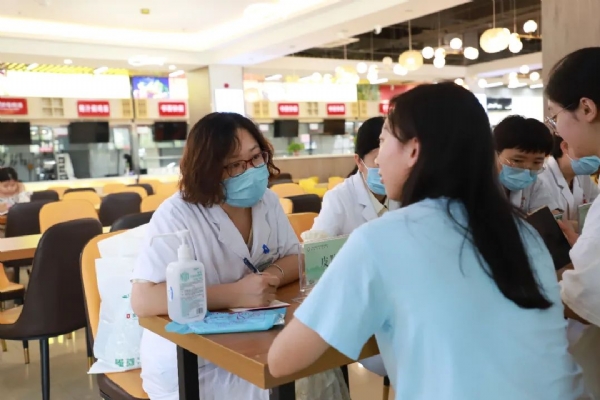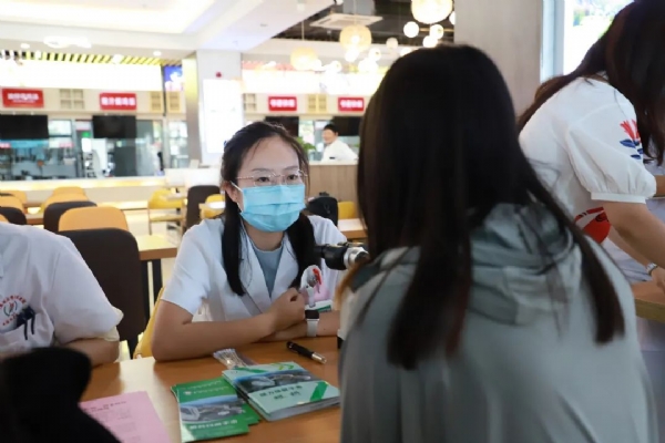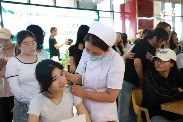 “夏至后熬夜可容易导致心火旺盛。”“你可以通过中医方法,比如适时适量运动、中药调理、泡脚等,促进身体新陈代谢,保持健康。”在健康义诊服务区和中医适宜技术体验区,医护专家团为老师和学生们现场进行把脉义诊、检查治疗,并耐心解答他们的问题,给予夏季个性化的养生建议。中医特色护理人员一边为师生们进行健康检查,一边为他们提供推拿、耳穴压豆等中医特色技术体验。