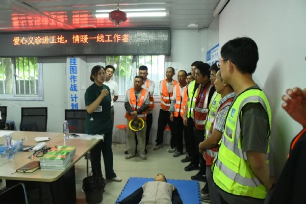 在活动现场,我院医护人员为奋斗在一线的工友们发放了防暑降温中药汤剂、矿泉水、毛巾等防暑降温物资,并开展了健康义诊和宣传讲解。急诊、外科医护人员针对高温中暑、骨折、出血等工地常见伤害的应急急救知识等多项内容进行了集中宣传,并为工友们现场演示心肺复苏有关操作。医护人员们耐心细致的宣教得到了在场人员的一致认可和好评,大家纷纷表示将会利用所学到的知识做好自身安全防护。活动结束后,中建八局第二建设有限公司工程项目部向我院发来感谢信,对我院组织开展此次慰问活动表示诚挚感谢。