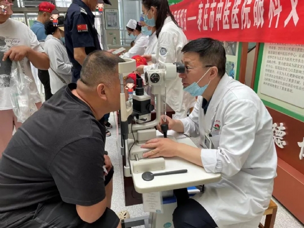 在义诊现场,眼科专家宋传海在门诊大厅为市民做免费眼健康检查。