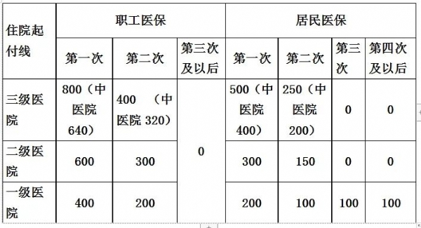 居民:第一次起付线为400元(同级其他医院500元),第二次起付线为200元(同级其他医院300元),第三次以后为0元。