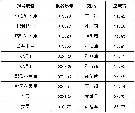 2023年度枣庄市中医医院备案制工作人员公开招聘笔试和面试工作已经结束,按照招聘简章要求,根据考试合格人员考试总成绩,由高分到低分按1:1的比例,确定进入考察体检范围人选。个人成绩可登录报名网站查询。现将人员名单予以公布,公示期自2023年8月28日至9月1日,如有异议请联系0632-3068011。