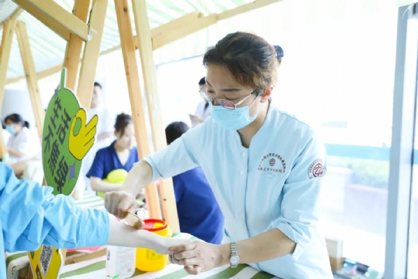 “这个是乌梅,夏天煮水喝能祛暑;这个是绿豆,和百合一起熬汤最适合三伏天……”本草识别站的展台上,荷叶、莲子、菊花等10余种夏季常见药食同源食材整齐排列。药学部副主任张洪冰通过“看、闻、摸”的互动方式,教市民辨别食材功效,并做现场科普路演。“原来厨房的调料都是‘养生宝’,回去就给家人煮起来!”市民陈阿姨边记笔记边说。