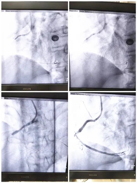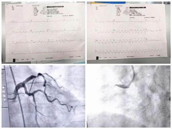 在整个抢救过程中,所有医护人员各司其职,抢救工作高效、有序进行,通过电除颤等一系列的抢救措施,患者生命体征相对稳定。阚国庆主任与患者家属沟通病情,结合患者疾病特点,应立即行急诊冠脉造影及急诊冠状动脉支架植入术,否则患者随时存在生命危险,患者家属表示知情并理解,同意进行手术治疗。遂将患者立即平稳转运至导管室行术前准备,同时麻醉科团队也迅速到位做好手术保障工作。造影示:前降支中段70%—80%狭窄,右冠开口100%闭塞,立即开通闭塞的右冠,给予充分缺血预适应,患者血管开通后,多次出现室性心动过速、室颤,先后给予11次电除颤,并根据心率、血压及时调整药物,待患者心率、血压稳定后,于右冠近段置入支架1枚。由于患者心肌梗死面积大,为了更好地避免心力衰竭及其他器官灌注不足,术后立即置入主动脉球囊反搏泵(IABP)以减轻心脏负荷、保证重要脏器血液灌注。北京中医药大学东方医院驻我院专家范宗静主任给予患者床旁心脏彩超检查评估病情并指导治疗,经过治疗患者安全转出ICU到心血管病房继续治疗,在病房患者感谢阚国庆主任紧紧握住他的手不能松开,还给阚主任点赞,这一握手是患者对我们的感谢、对医护人员工作的肯定,也是我们一直奋斗的动力源泉。
