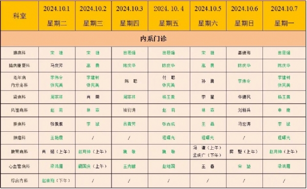 假日期间,我院急诊24小时值班,各项检查、手术正常进行,门诊每天都有专家坐诊。为减少假期扎堆就诊的情况,建议您提前预约,合理安排就诊、检查及手术时间。为了方便您就医,现对节日期间各诊室坐诊做如下安排: