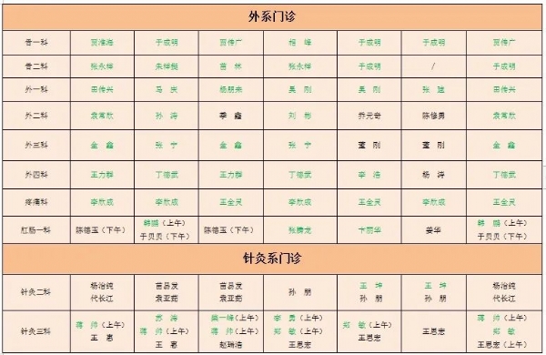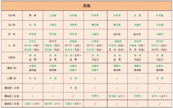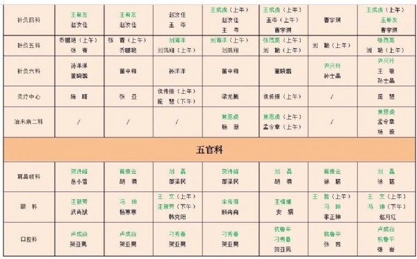备注:绿色为专家或科主任,黑色为主治医师或普通门诊,“/”表示当日无门诊排班。1、新城院区地址:薛城区太行山路2666号,枣庄高铁站东1000米,预约咨询电话:0632-3068122,3062395. 总值班电话:3068366;2、市中院区地址:市中区公胜街24号,预约咨询电话:0632-3068277,总值班电话:3068018。