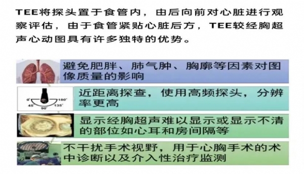 由于食道贴近心脏后方,可以避免胸壁和肺气等因素的干扰,对观察微小血栓等异常结构优于常规心脏超声检查。