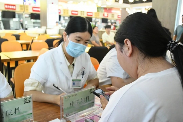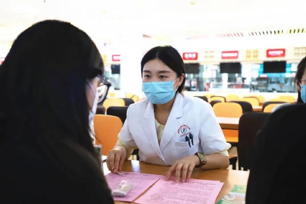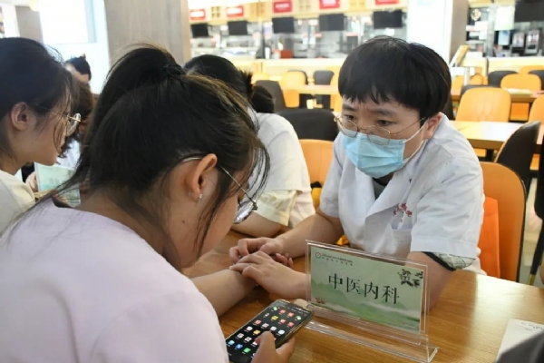 “夏至后熬夜可容易导致心火旺盛。”“你可以通过中医方法,比如适时适量运动、中药调理、泡脚等,促进身体新陈代谢,保持健康。”在健康义诊服务区和中医适宜技术体验区,医护专家团为老师和学生们现场进行把脉义诊、检查治疗,并耐心解答他们的问题,给予夏季个性化的养生建议。中医特色护理人员一边为师生们进行健康检查,一边为他们提供推拿、耳穴压豆等中医特色技术体验。