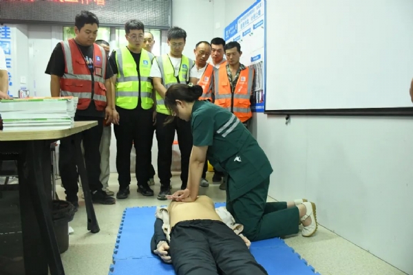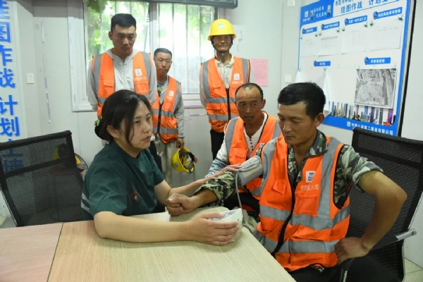 在活动现场,我院医护人员为奋斗在一线的工友们发放了防暑降温中药汤剂、矿泉水、毛巾等防暑降温物资,并开展了健康义诊和宣传讲解。急诊、外科医护人员针对高温中暑、骨折、出血等工地常见伤害的应急急救知识等多项内容进行了集中宣传,并为工友们现场演示心肺复苏有关操作。医护人员们耐心细致的宣教得到了在场人员的一致认可和好评,大家纷纷表示将会利用所学到的知识做好自身安全防护。活动结束后,中建八局第二建设有限公司工程项目部向我院发来感谢信,对我院组织开展此次慰问活动表示诚挚感谢。