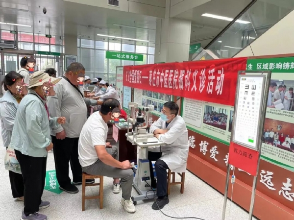 在义诊现场,眼科专家宋传海在门诊大厅为市民做免费眼健康检查。
