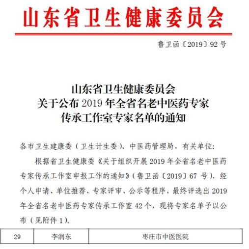 为切实做好名老中医药专家学术思想传承工作,山东省卫生健康委员会开展2019年山东省名老中医药专家传承工作室建设项目申报工作,经过层层推荐和严格遴选,我院李润东主任医师获批枣庄市唯一一名全省名老中医药专家传承工作室专家。
