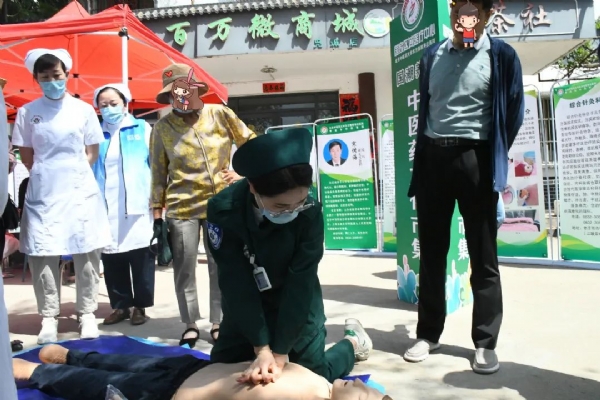 清晨的集市热闹非凡,闻讯赶来的群众早早排起了长队。活动现场,各项工作井然有序,在健康问询区,临床人员用“拉家常”的方式,热情、耐心地为群众问诊把脉,解答健康咨询,提供膳食和用药指导。在中医护理技术体验区,护理人员提供了耳穴压豆、刮痧、推拿等中医药特色服务;科普了中医降压操、手指养生操等中医养生常识,在场群众在体验特色疗法的同时,一招一式跟着模仿练习。在急救技能教学区,工作人员现场示范心肺复苏急救技能,讲解日常自救互救方法。在中药药材展示区,工作人员推介了我院院内制剂、膏方丸剂等道地药材及中药智慧煎煮、配送等惠民服务项目。