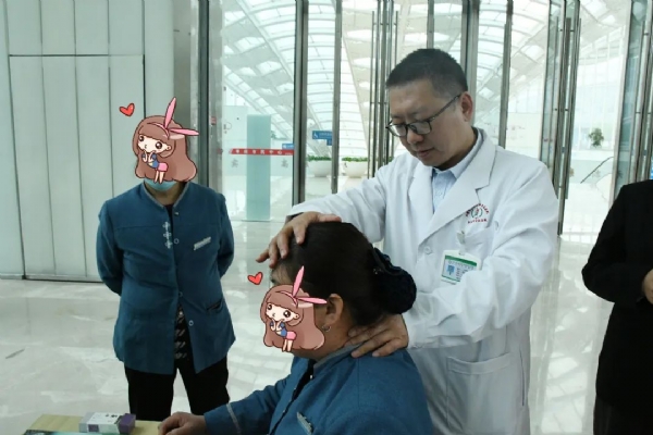 中医适宜技术体验区,护理门诊的马滕护士长带领护理团队一边为市民进行血糖、血压测量,一边耐心地给他们做耳穴压豆、头颈部刮痧、颈肩按摩等中医特色技术体验活动,并给出合理的治疗、健康养生等建议。