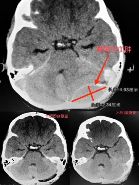 患儿为7岁的学龄儿童,在家玩耍时摔倒头枕部,伤后患儿头痛,但无其他症状,未就医。外伤约16小时后患儿出现恶心、呕吐,遂来诊,查头颅CT示左枕骨骨折并伴有左枕部跨静脉窦部硬膜外血肿,因血肿位置特殊,一旦处理不当便会引起灾难性的静脉窦大出血,从而危及生命。入院时因出血量不多,不具有手术指征,故决定采取保守治疗。同时,医生根据临床经验,考虑到此硬膜外血肿属于非稳定血肿,采取了动态复查颅脑CT并严密观察患儿病情变化。在入院的第二天凌晨2点左右,医务人员发现患儿恶心、呕吐加重,同时意识状态转差,考虑可能由患儿颅内血肿增加所导致,经过复查头颅CT证实出血量呈进行性明显增多趋势,继续观察有增加脑疝风险,须果断手术治疗。于是紧急在全麻下行枕部跨横窦硬膜外血肿清除术。在神经外科医护团队、手术麻醉科团队和ICU团队的密切协作之下,患儿顺利的度过了危险期。目前,患儿恢复良好,言语表达流畅,思维敏捷,四肢活动良好,未出现脑功能后遗症。术后1周小朋友便能下床活动,在家长的引领下,给科室医护人员送来了锦旗和一捧别具心裁的文具花束,表达对医护叔叔阿姨们的谢意。