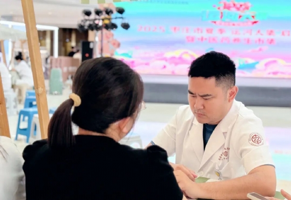 “运河医心·名中医义诊堂”内,北京中医药大学东方医院枣庄医院脑病中心、心血管病科、脾胃病科、妇产科、儿科、肝胆病科、治未病二科、风湿病科等科室带头人及青年骨干一一坐镇,为市民把脉问诊,结合夏季气候特点讲解养生要点:“出汗多易伤脾胃,饮食需忌生冷……”