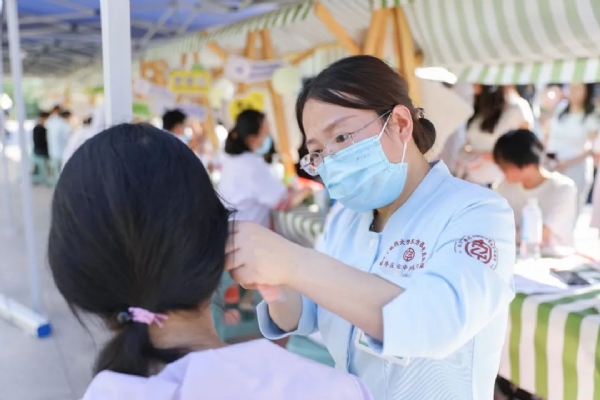 活动现场,来自医院市中院区的心脑病科、妇产科、综合针灸科、针灸二科、综合内科、肛肠二科等领域的专家团队坐镇义诊区,为师生提供“一对一”诊疗服务。专家们通过望闻问切,细致解答夏季常见的失眠、脾胃失调、颈椎疲劳等问题,并开具个性化调理方案,传递“未病先防”理念。