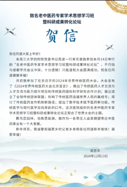 12 月 14 日,名老中医药专家学术思想学习班暨枣庄市营养学会食药同源专业委员会第二届学术年会在我院隆重召开。此次会议汇聚了来自省内外多位名老中医,吸引了枣庄市营养学会会员、中医界人士以及食药同源产业相关人员共 200 余人参会,会议由市营养学会食药同源专业委员会秘书长褚福浩与枣庄市中医医院主任医师陈曦主持。会议伊始,我院党委书记周波与市营养学会会长陆希锋分别致辞,对年会的召开表示祝贺,并强调了食药同源在健康领域的重要性与广阔前景,会议收到北京中医药大学原校长高思华教授发来的贺信。